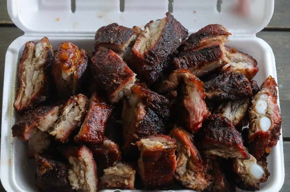 Smoked rib tips recipe featuring tender and meaty pieces of pork ribs rubbed with spices.